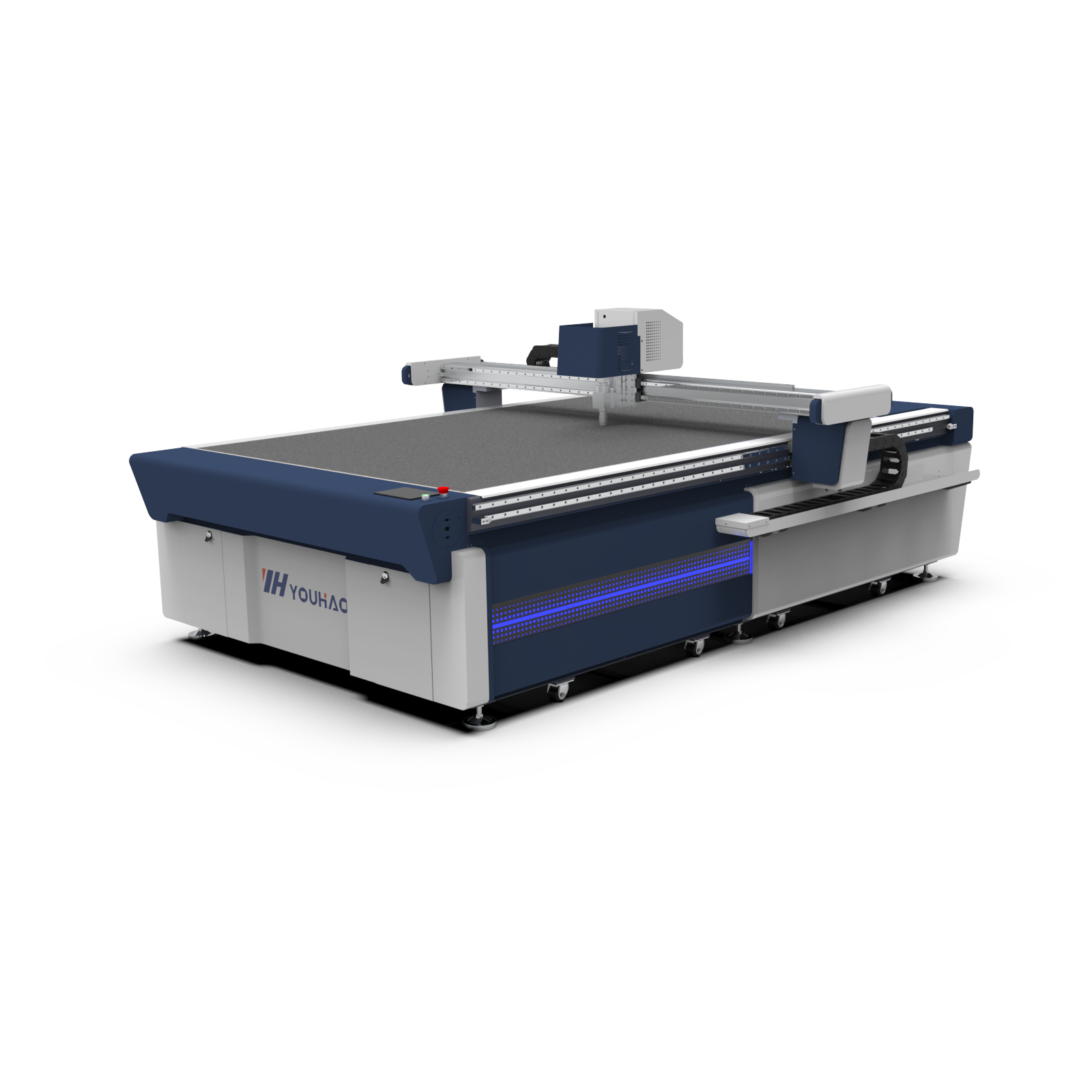 The machine features a multi-zone vacuum adsorption table (8-48 zones) that automatically adjusts suction areas to ensure material stability and cutting precision.